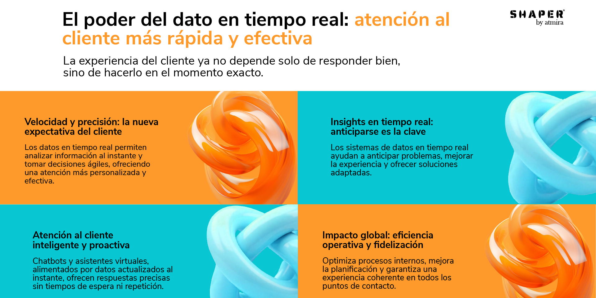 En definitiva, los datos en tiempo real representan una revolución en la experiencia del cliente. Permiten ofrecer un servicio más rápido, proactivo y adaptado a las necesidades individuales, fortaleciendo la relación con el usuario y aumentando su fidelización. ¿Tu infraestructura está lista? Apuesta por el dato en tiempo real y lleva tu experiencia de cliente al siguiente nivel. ¡Habla con un experto ahora! Contacto – Shaper by atmira